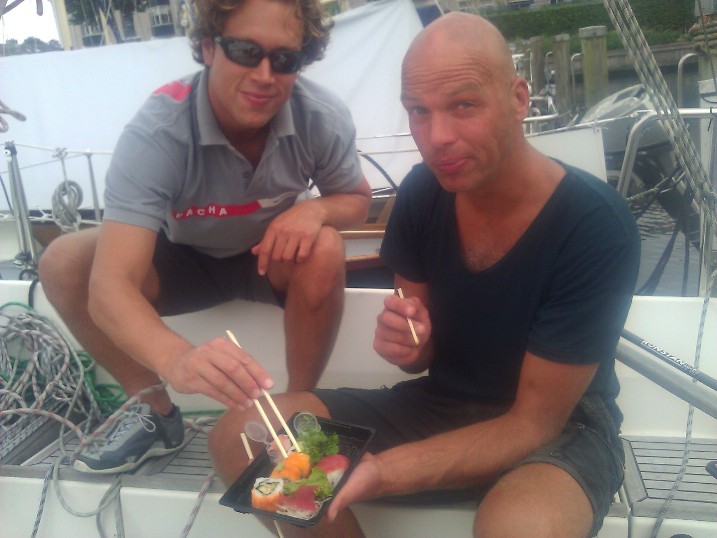 Oppassen voor de ferries en vooral de vissersboten die volle snelheid door geul heen varen! In Harlingen heb ik een taktische rustpauze ingelast. De wind zou namelijk naar het Noordwesten draaien, terwijl de wind bij aankomst in Harlingen nog uit het Zuidwesten kwam. NW is ideaal voor de Boontjes richting Kornwerderzand en dus het wachten meer dan waard. Na ongeveer 3,5 uur en een aantal flinke buien was het zover. En inderdaad de Boontjes was/waren bezeild. Na de sluisdoorgang op het IJsselmeer gelijk doorgevaren richting de Oude Zeug. Het windje was nog steeds NW 3, maar er werd meer wind aangekondigd. Eerder in de race waren dat nog waarschuwingen voor 7-8, nu werd gewaarschuwd voor windkracht 6. Twee rakken verder (waarvan overigens nog 1 op spi aangezien de Ando en ik een prive-race hadden) was het om 19:30 dan zover, maar dan geen windkracht 6 maar die eerder beloofde windkracht 7 – 8. Snel een dubbel rif in het grootzeil een de rolgenua bijna helemaal weg. Na de tonronding voor Medemblik en een stroomrondje, voor de wind (en inmiddels in het pikkedonder) richting Enkhuizen. Ondanks dat er bijna geen zeil meer op stond, surfde de Kick over de snel opgebouwde golven ruim 9 knopen door het water. Een beetje teveel van het goede en al helemaal omdat ik in deze omstandigheden de stuurautomaat niet kan meer vertrouwen en alles met de hand aan de helmstok moest doen. Bij het volgende merkteken (KG) heb ik de baan verlaten en in de kom van Enkhuizen voor anker gegaan. Welverdient een heel effectief biertje gedronken. Licht aangeschoten ben ik kort daarna heerlijk in slaap gevallen (overigens nog wel flink gedroomd over kapzeizen, mmmm…).